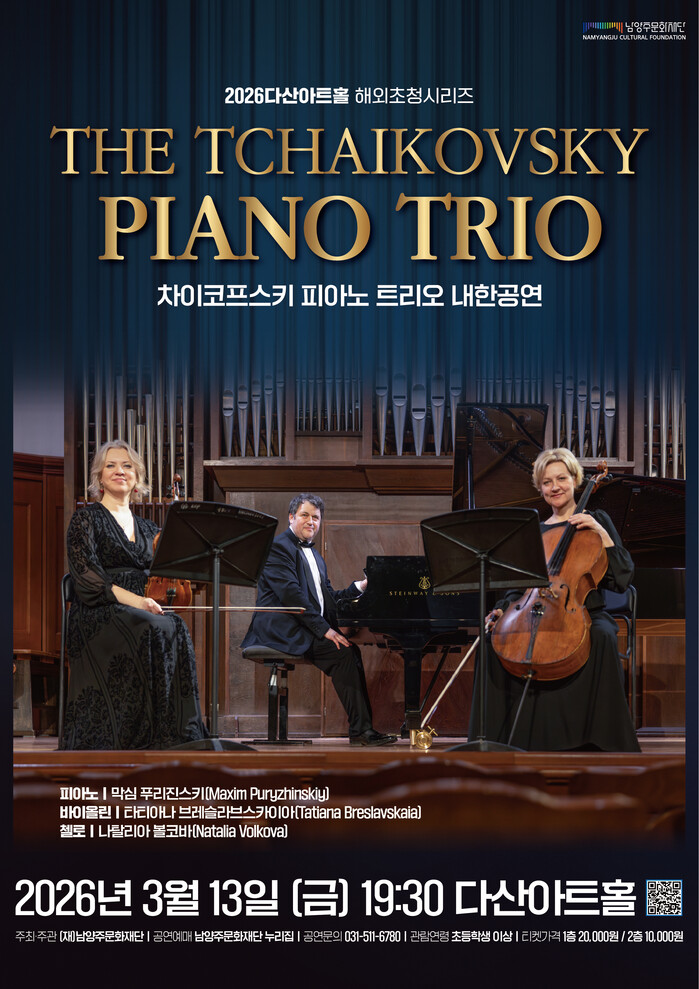 차이코프스키 피아노 트리오는 2015년 창단된 앙상블로, 콘서바토리 출신 연주자들로 구성돼 정통 실내악 기반의 연주를 이어가고 있다. △피아니스트 막심 푸리진스키 △바이올리니스트 타티아나 브레슬라브스카이아 △첼리스트 나탈리아 볼코바 등 국제적으로 인정받은 연주가들이 참여해 깊이 있는 연주를 선보인다.