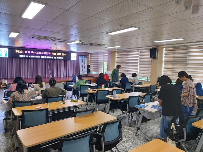 이번 하계 특수교육지원인력 역량 강화 연수는 △장애아동에 대한 이해 및 인권 존중 역량 강화 △특수교육실무원의 심미적 감수성 회복을 통한 직무 만족도 향상을 주제로 진행되었다.