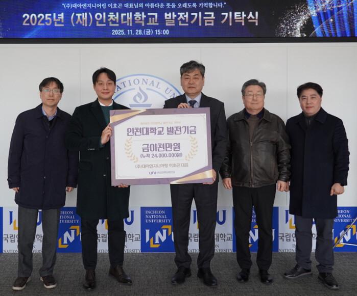 기탁식에는 인천대 이인재 총장과 기부자인 대아엔지니어링 이호곤 대표, 윤병조 발전기금 상임이사 등이 참석, 발전 기금 전달과 함께 감사장 수여식이 진행됐다.