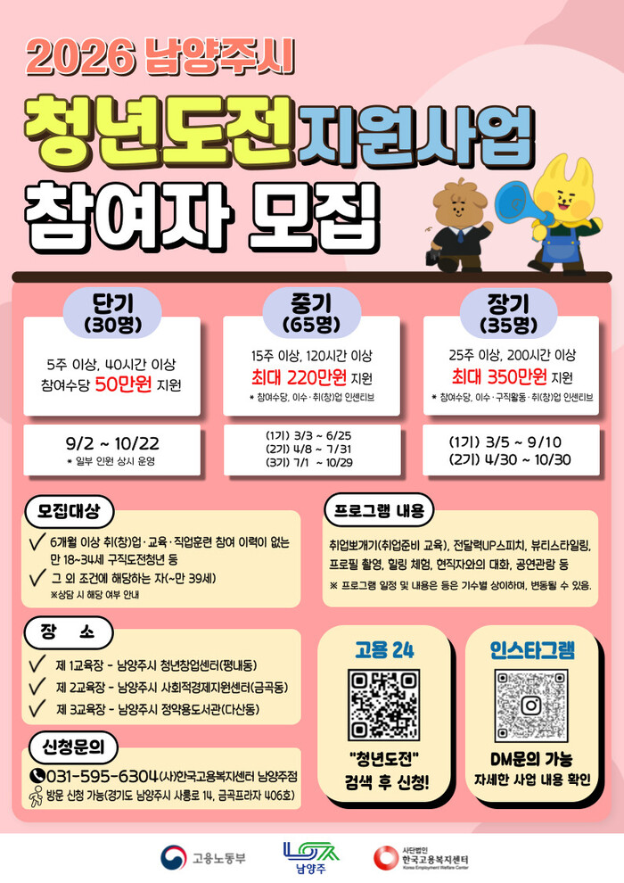 신청은 ‘고용24’ 누리집 또는 전단 포스터에 안내된 큐알(QR)코드를 통해 가능하며, 자세한 문의는 (사)한국고용복지센터 남양주점으로 하면 된다.