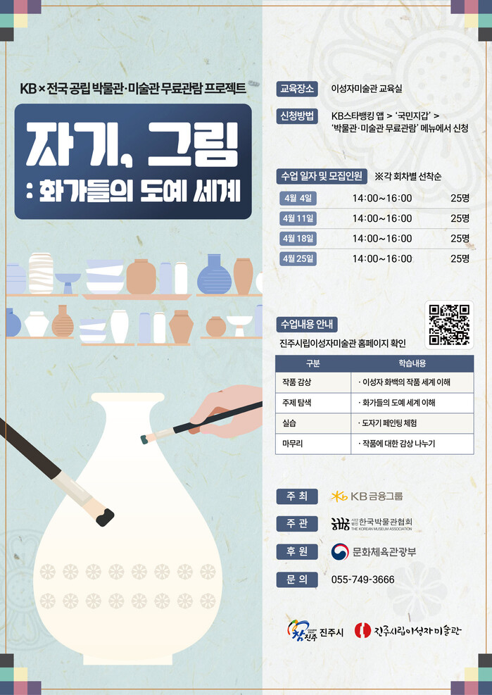 이번 사업은 KB금융그룹이 문화 향유 기회 확대를 위해 추진하는 문화공헌 사업으로, 한국박물관협회와 공동으로 진행된다. 진주시립이성자미술관은 이번 사업을 통해 시민과 방문객이 보다 부담 없이 미술관을 찾고, 미술을 친근하게 접할 수 있는 참여형 프로그램을 선보일 예정이다.