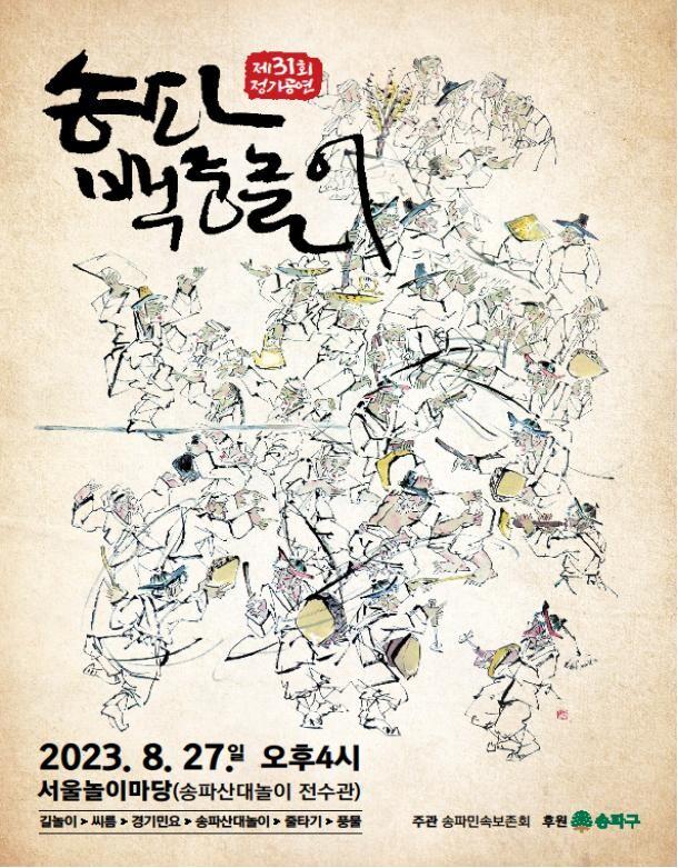 한편, 이번 공연을 주최하는 (사)송파민속보존회는 국가무형문화재 제49호로 지정된 ‘송파산대놀이’와 서울특별시 무형문화재 제3호 ‘송파다리밟기’를 보유한 단체이다. 특히 ‘송파산대놀이’는 지난 2022년 유네스코 인류무형유산에 등재되어 그 가치를 인정받은 바 있다.