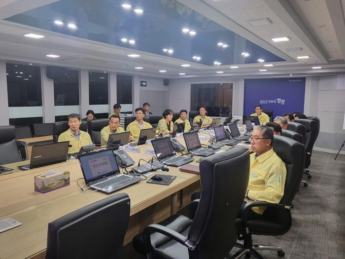이어 8일 진병영 군수 주재로 열린 1차 긴급회의에서는 공사장, 축사, 비닐하우스 등 각종 시설물 안전점검 및 산사태, 급경사지, 하천범람 등 재해취약지역에 대한 지속적인 순찰활동과 신속조치를 하도록 하였으며, 주민대피계획 수립 등 안전관리 실태 전반을 살폈다.