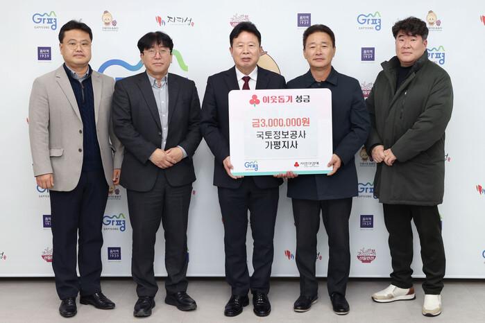 이와 함께 한국국토정보공사 가평지사도 지난 24일 지역 내 어려운 이웃을 위해 성금 300만원을 기탁했다. 김용 지사장은 “공공기관으로서 사회적 책임을 다하고자 성금을 전달하게 됐다”며 “지역과 상생하는 나눔 활동을 지속하겠다”고 말했다.