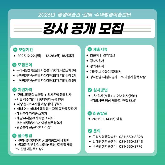 기타 자세한 내용은 구리시평생학습관·갈매평생학습센터·수택평생학습센터로 문의하면 된다.