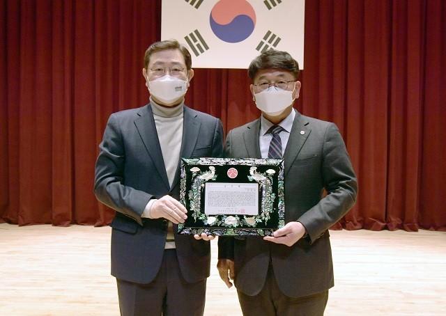 [광주=정찬남 기자] 이용섭 광주광역시장이 25일 오전 시청 대회의실에서 열린 김종효 행정부시장 퇴임식에 참석해 공로패를 전달한 후 기념촬영을 하고 있다. /광주광역시 제공