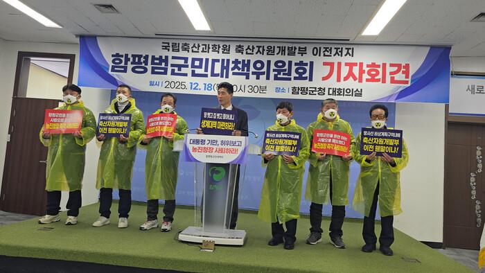 [함평=황승순 기자]함평군으로의 국립축산과학원 축산자원개발부(이하 축산원) 이전 사업이 ‘국가 안전 가이드라인 위반’이라는 중대한 법적·윤리적 결함에 직면했다. 함평범군민대책위원회(상임대표 오민수, 이하 범대위)는 12월 18일 오전 10시 30분 함평군청 대회의실에서 기자회견을 열고, 주민의 생존권과 국가적 안전을 무시한 이번 사업의 원천 무효를 선언하며 강력한 투쟁을 예고했다.