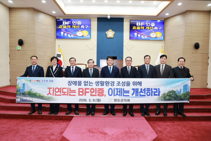 완도군의회는 “BF 인증 제도가 본래의 취지를 충실히 살리면서도 현장 여건에 맞게 운영될 수 있도록 제도 개선이 필요하다”며 “주민 불편을 최소화하고 제도의 실효성을 높이기 위한 합리적인 개편이 이루어져야 한다”고 밝혔다.