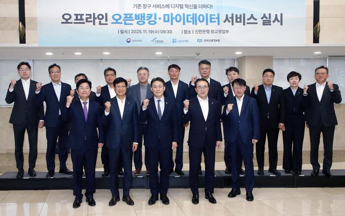 | ▲ 서울시 중구 소재 신한은행 광교영업부에서 진행된 ‘오프라인 오픈뱅킹·마이데이터 서비스 시연행사’에서 정상혁 신한은행장(뒷줄 오른쪽 첫번째)과 금융위원회 권대영 부위원장(앞줄 가운데), 조용병 은행연합회장(앞줄 오른쪽 두번째) 등 내빈들이 기념촬영하는 모습 |