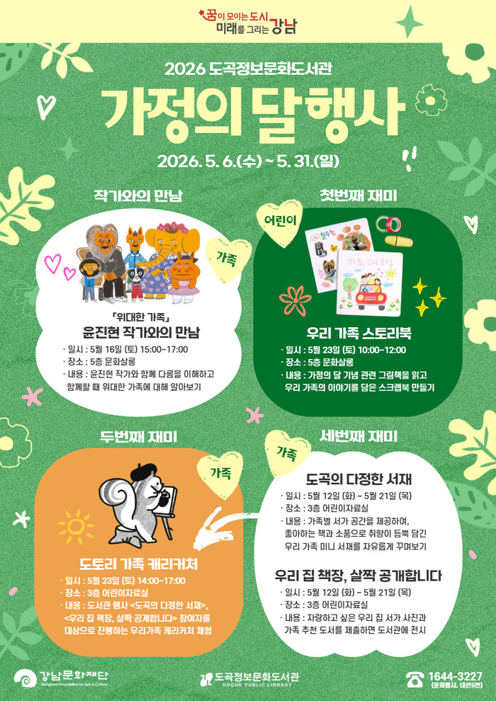 이와 함께 5월 12일(화)부터 5월 21일(목)까지 3층 어린이자료실에서는 가족 참여형 행사도 운영된다. <도곡의 다정한 서재>는 가족별 서가 공간을 자료실에 제공하여 좋아하는 책과 소품으로 각자의 취향이 담긴 우리 가족만의 미니 서재를 자유롭게 꾸며보는 프로그램이다. 또한 <우리 집 책장, 살짝 공개합니다>는 자랑하고 싶은 우리집 서가 사진과 가족 추천 도서를 제출하여 도서관에 전시하는 행사로, 가족의 독서 문화를 함께 나누는 기회를 제공한다.