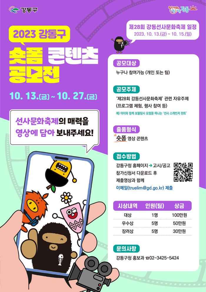 접수 기간은 10월 13일부터 27일 오후 6시까지 2주간이며, 제작한 숏폼 영상 원본을 신청서류와 함께 담당자 이메일([email protected])로 제출하면 된다. 신청서류는 강동구청 홈페이지 고시·공고에서 내려받아 작성하면 된다.
