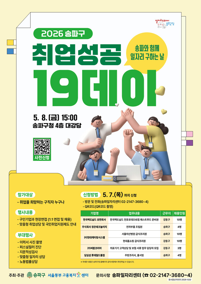 이번 ‘2026 송파구 취업성공 1·9데이’는 송파구와 고용노동부 서울동부고용노동지청이 공동 주최하며, ▲한국맥도날드 유한회사 ▲주식회사 경은테크놀러지 ▲(주)현대캐터링시스템 ▲(주)씨팝코리아 ▲딤딤섬 롯데월드몰점 등 5개 기업이 참여한다. 모집 분야는 고객응대, 판매, 조리, 전자부품 조립, CS 등이며, 자세한 내용은 송파구 일자리 누리집 및 송파구청 누리집 공지사항에서 확인할 수 있다.