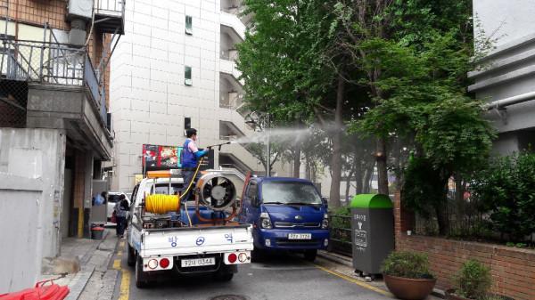 | ▲ 구 보건소 방역반이 공동주택 인근 공원에서 방역제를 살포하며 방역활동을 하고 있다. (사진제공=동대문구청) | ||