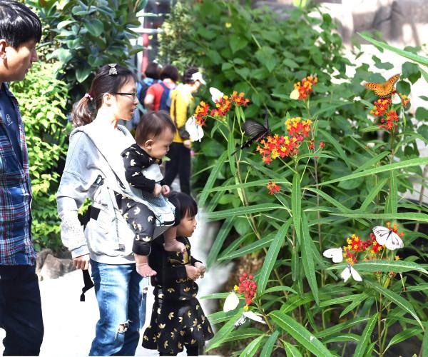 | ▲ 나비온실에서 나비를 구경 중인 방문객들의 모습. (사진제공=노원구청) | ||