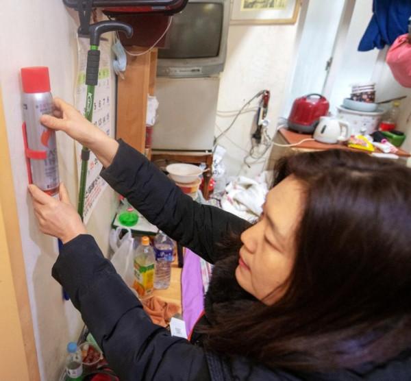 | ▲ 자원봉사자가 쪽방촌에 간이소화용구를 설치하는 모습. (사진제공=용산구청) | ||