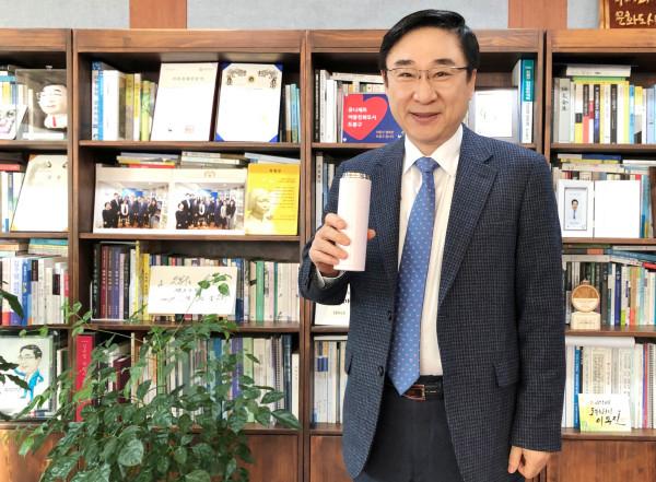 | ▲ 이동진 구청장이 일회용 컵 대신 텀블러를 들고 있는 모습. (사진제공=도봉구청) | ||
