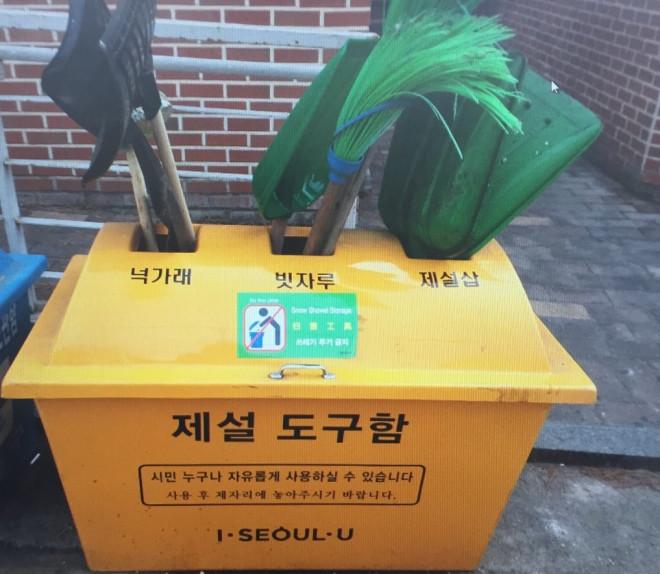 현재 강동구에는 총283개소의 제설함이 있다. 이 중 이면도로 고갯길, 고지대 등 제설 취약지역구간에 염화칼슘, 소금, 삽 등이 보관돼 있다. 보행자가 많은 버스정류소, 지하철 역사 등 다중이용시설 33곳에는 넉가래와 빗자루 등 무료로 제공하는 무료제설 도구함도 있다.