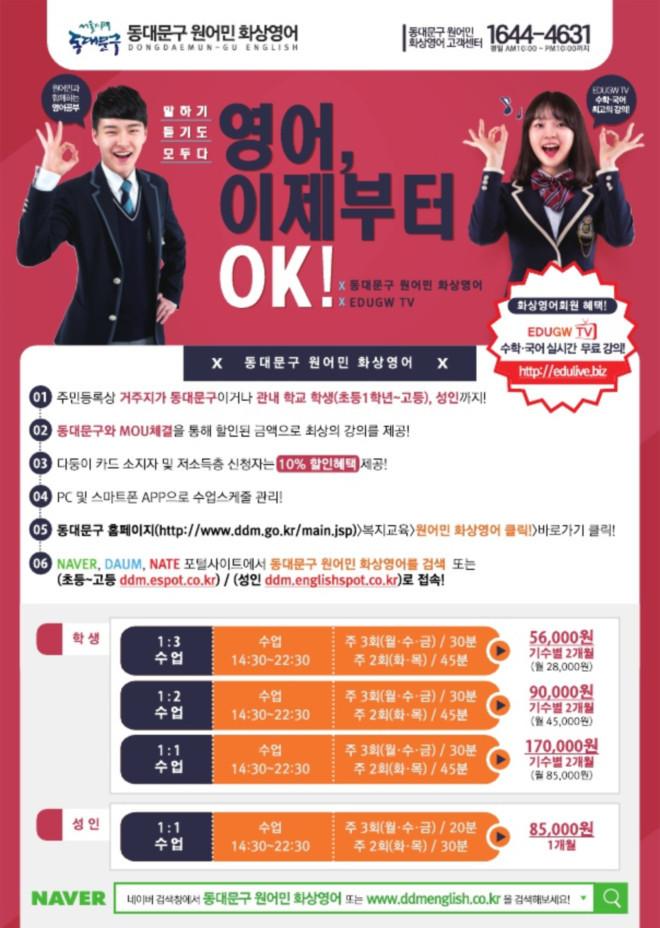 수강을 희망하는 초‧중‧고교 학생은 동대문구 원어민 화상영어 홈페이지에서, 성인은 동대문구 성인 원어민 화상영어 홈페이지에서 신청하면 된다.