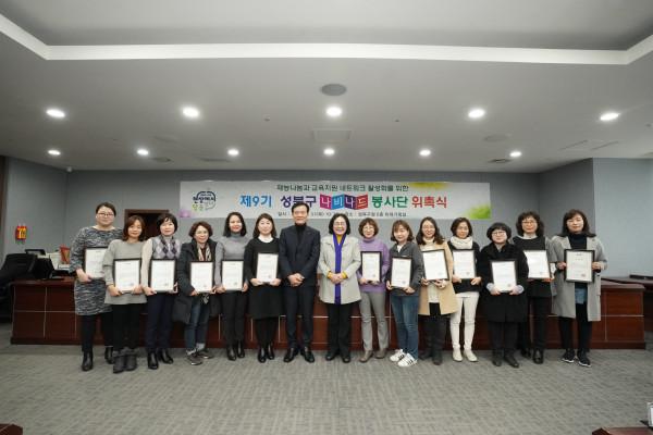 | ▲ 최근 열린 '제9기 성북구 나비나드 봉사단' 위촉식에서 이승로 구청장(왼쪽에서 일곱 번째)과 더불어민주당 유승희 의원(가운데) 및 위촉 봉사단들이 기념촬영을 하고 있다. (사진제공=성북구청) | ||