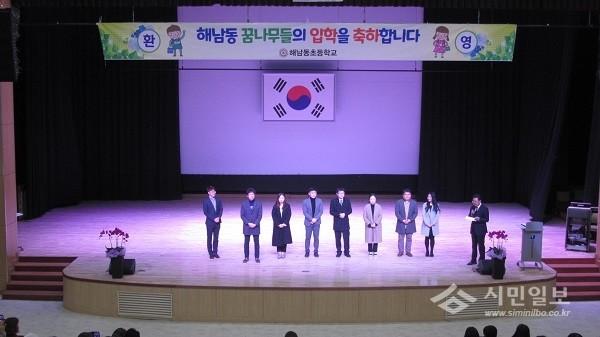 오전 10시에 열린 입학 및 개학식은 192명의 1학년 신입생이 6학년 선배들의 손을 잡고 입장하는 것으로 시작해 입학생과 학부모를 위해 해남 땅끝 오케스트라의 축하 공연도 펼쳐졌다.