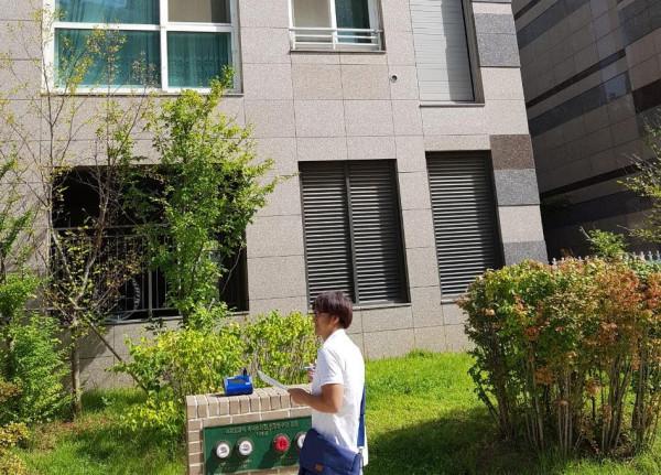 | ▲ 관계자가 미세먼지 측정기를 활용해 아파트 외부 미세먼지 수치를 측정하고 있는 모습. (사진제공=영등포구청) | ||