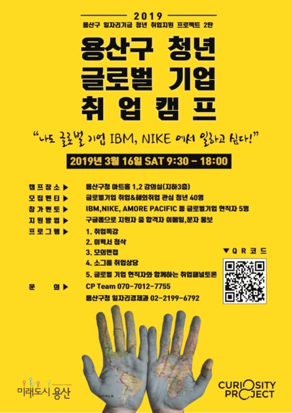 [시민일보=고수현 기자] 서울 용산구(구청장 성장현)가 오는 16일 구청 아트홀 강의실에서 해외 취업을 준비하는 청년을 위한 ‘용산구 청년 글로벌 기업 취업 캠프’를 연다.