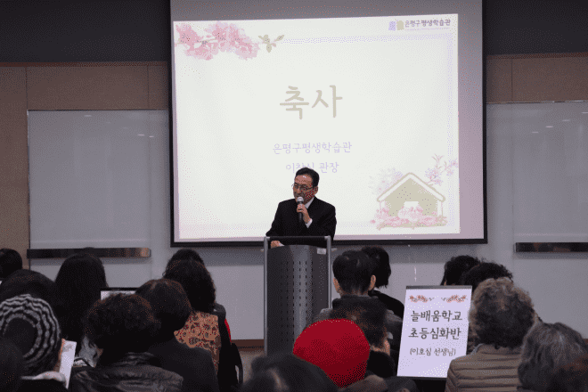 | ▲ 최근 열린 입학식에 참석한 이창식 은평구 평생학습관 관장이 축사를 하고 있다. | ||