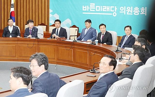 바른미래당 손학규 대표(테이블 왼쪽 여섯번째)와 김관영 원내대표 등 참석한 의원들이 20일 오전 국회에서 열린 비공개 최고위원회의 겸 의원총회에 참석해 주변을 둘러보고 있다. 바른미래당은 여야 4당의 선거제·개혁법안 패스트트랙(신속처리안건 지정) 추진 과정에서 내홍이 격화되고 있다.