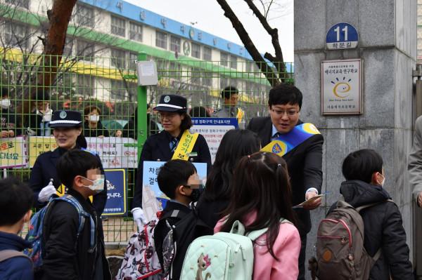 20일 서울 강남구의회가 새학기를 맞아 대치초등학교 앞에서 수서경찰서와 함께 ‘어린이 통학로 보행환경 개선 및 교통사고 예방을 위한 민·관·경 합동 캠페인’을 펼쳤다. 사진은 교문 앞에서 아이들에게 홍보물을 나눠주고 있는 이관수 의장의 모습. (사진제공=강남구의회)
