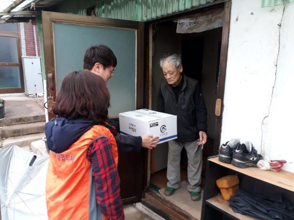 경기 이천시 백사면 행정복지센터는 최근 (주)웅비식품으로부터 지역내 어려운 이웃을 위한 조미김 150상자를 후원받아 저소득가구 및 홀몸노인 가구 등에 직접 방문해 전달했다. 사진은 이날 행정복지센터 관계자들이 노인에게 조미김을 전달하는 모습. (사진제공=이천시청)