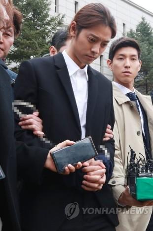성관계 동영상을 불법적으로 촬영·유통한 혐의를 받는 가수 정준영이 21일 서울중앙지법에서 열린 구속 전 피의자 심문(영장실질심사)을 마치고 법정 밖으로 나서고 있다. /연합뉴스