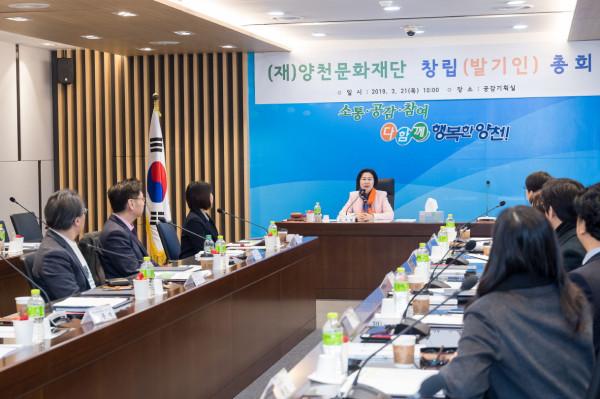 김수영 양천구청장이 최근 구청 4층 공감기획실에서 열리는 ‘양천문화재단 창립총회’에 참석해 회의를 열고, ▲문화재단 설립취지서(안) 채택 ▲정관(안) 및 제규정(안) 확정 ▲2019년 사업계획 및 예산(안) 심의의결 등을 실시했다. 사진은 창립총회에 참석한 김 구청장이 발언하는 모습. (사진제공=양천구청)