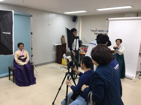 경기 이천시는 최근 올림푸스코리아와 청강문화산업대의 지원을 받아 이천시노인종합복지관에서 홀몸노인 등 70명에게 장수사진(영정사진) 지원사업을 진행했다. 사진은 참여자들이 노인의 사진을 찍고 있는 모습. (사진제공=이천시청)