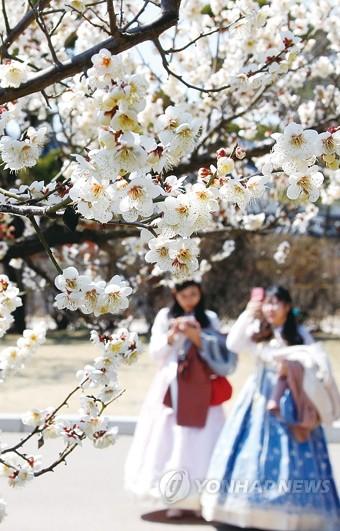 일요일인 24일 모처럼 미세먼지 걱정 없는 화사한 날을 맞아 경복궁을 찾은 관광객들이 활짝 핀 매화를 배경으로 한층 다가온 봄을 만끽하고 있다.