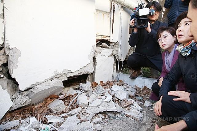 24일 경북 포항시 북구 흥해읍에서 자유한국당 나경원 원내대표가 2017년 지진으로 크게 부서진 대성아파트를 둘러보고 있다.