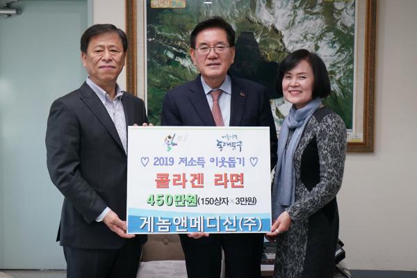 서울 동대문구(구청장 유덕열)가 게놈앤메디신(주)로부터 ‘콜라겐 라면’ 150상자(450만원 상당)를 기탁 받았다. 기탁품은 푸드마켓을 통해 지역 저소득층 노인에게 전달될 예정이다. 사진은 성품 기탁 후 기념촬영을 하고 있는 유덕열 구청장(가운데)의 모습. (사진제공=동대문구청)