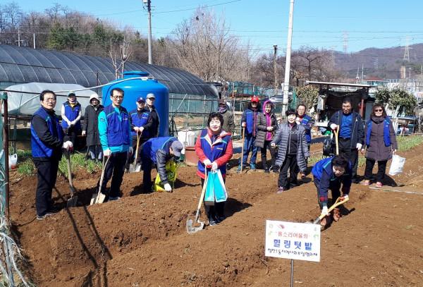 인천 부평구 청천1동 지역사회보장협의체는 최근 홀몸 취약가구 10여명이 참여한 가운데 나비공원 부근 텃밭에서 밑거름 주기, 밭 갈기, 이랑 만들기, 씨 뿌리기 등 ‘봄날 힐링 텃밭농장 체험활동’을 했다. 사진은 기념촬영을 하는 모습. (사진제공=부평구청)