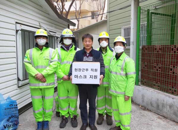 | ▲ 구 관계자가 현장근무 직원에게 미세먼지 예방 마스크를 지급한 모습. (사진제공=도봉구청) | ||