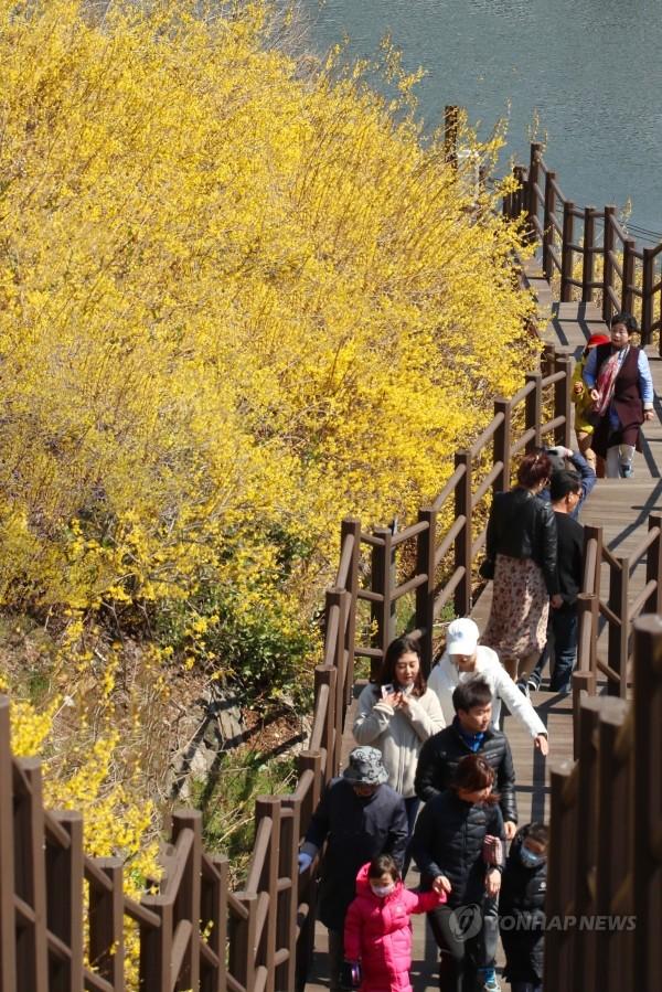 전국적으로 맑은 날씨를 보인 24일 성동구 응봉산을 찾은 시민들이 활짝 핀 개나리를 만끽하고 있다.