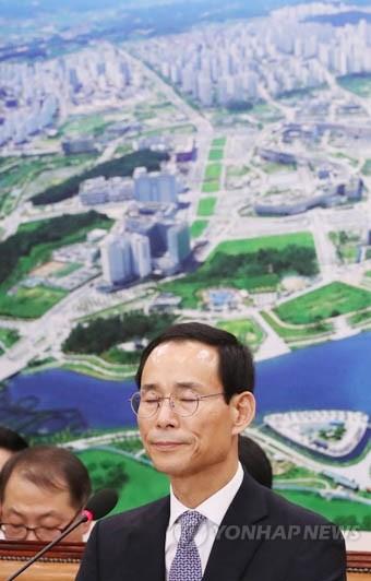 최정호 국토교통부 장관 후보자가 25일 국회 국토교통위원회에서 열린 인사청문회에서 다주택 보유에 대한 질문을 받고 있다. 회의장 벽에는 최 장관 후보자가 분양권을 소유한 세종시 사진이 걸려 있다.