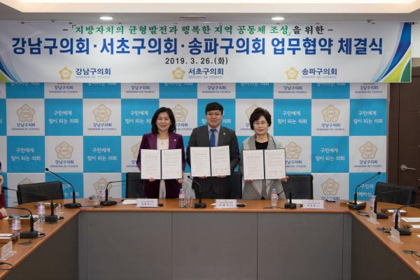 서울 강남구의회는 26일 서초구의회 및 송파구의회와 함께 '지방자치의 균형발전과 행복한 지역 공동체 조성'을 위한 업무협약을 체결했다. 사진은 안종숙 서초구의장(왼쪽부터), 이관수 강남구의장, 이성자 송파구의장이 협약서를 들고 기념촬영을 하는 모습. (사진제공=강남구의회)