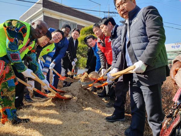 경기 파주시 법원읍 행정복지센터는 지난 24일 법원읍 아프리카봉사단과 함께 지역주민, 학생, 군장병, 파주시 지역내 가나인 모임 등 200여명이 참석한 가운데 식목행사를 개최했다. 이날 식목행사에는 디피에 아쟈코 쿠시 가나대사, 최종환 시장 등이 참석했다. 사진은 참여자들이 삽으로 흙을 퍼내며 기념촬영을 하는 모습. (사진제공=파주시청)