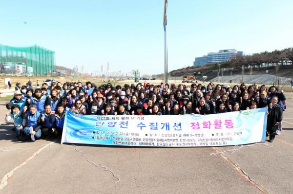 서울 구로구가 최근 ‘제27회 세계 물의 날’을 맞아 안양천을 사랑하는 시민의 모임, 주부환경 구로구연합회, 도림천을 사랑하는 시민의 모임 등 주민 150여명이 참여한 가운데 안양천 수질개선 정화활동을 했다. 사진은 기념촬영을 하는 모습. (사진제공=구로구청)
