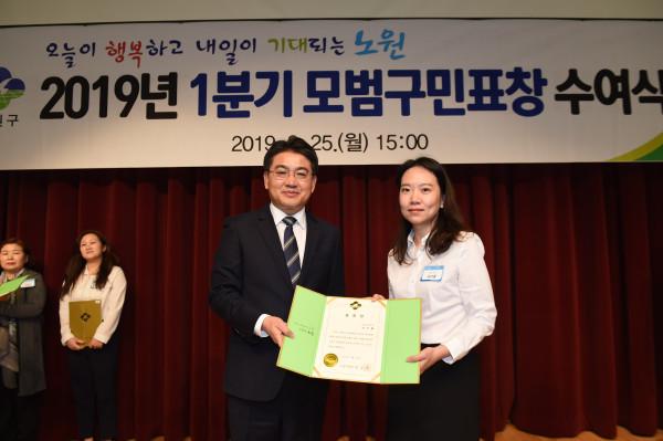 오승록 서울 노원구청장은 25일 오후 3시 구청 소강당에서 열린 ‘2019년 1분기 모범구민표창 수여식’에 참석해 지역사회를 위해 헌신한 모범 구민 77명에게 표창장을 수여했다. 사진은 오 구청장이 수상자와 기념촬영을 하는 모습. (사진제공=노원구청)