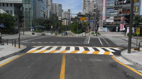 | ▲ 2018년 고원식 횡단보도를 설치한 상왕십리동(양지사거리~황학사거리 사이) 교차로 모습. (사진제공=성동구청) | ||