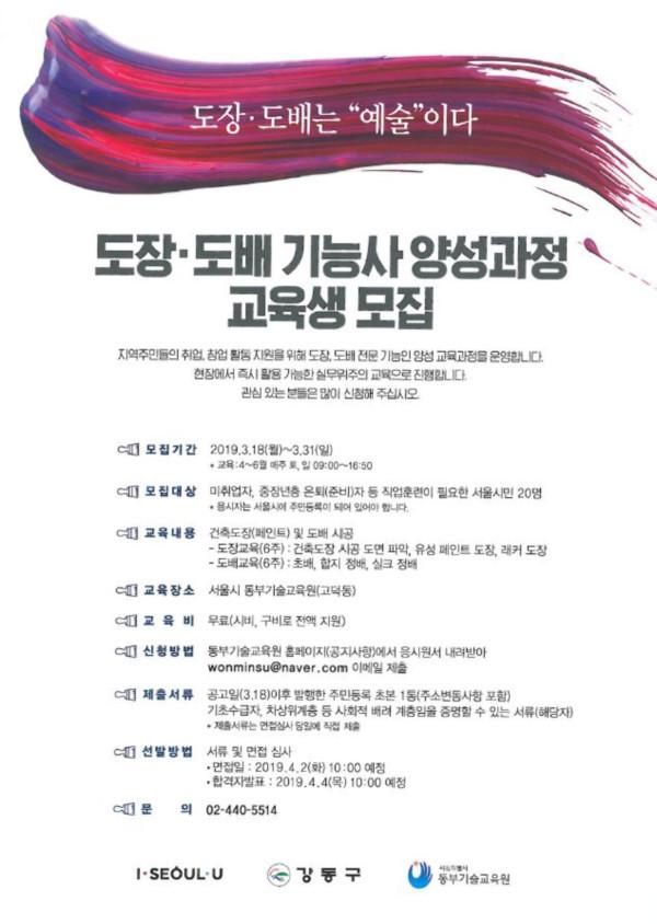 [시민일보=이대우 기자] 서울 강동구(구청장 이정훈)가 오는 31일까지 다양한 연령대에서 도전 가능한 일자리 창출을 위해 2019 상반기 ‘건축 도장·도배 기능사 양성과정’ 참여자를 모집한다.
