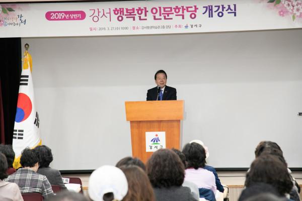 서울 강서구는 27일 평생학습관에서 수강생 120여명이 참석한 가운데 ‘행복한 인문학당’ 개강식을 개최했다. 이날 조윤범 바이올리니스트가 동유럽 음악적 특색에 대해 강의했다. 사진은 개강식에서 노현송 구청장이 인사말을 전하는 모습. (사진제공=강서구청)
