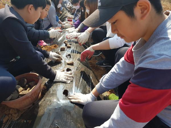 경기 김포시 금성초등학교는 최근 종합사회복지관과 연계한 녹색 생태 체험교육을 실시했다. 체험교육은 학년군별 다양한 친환경 활동 프로젝트로 운영됐으며, 직접 텃밭을 조성하는 활동 등으로 진행됐다. 사진은 체험교육에 참여한 학생들이 텃밭을 만들고 있는 모습. (사진제공=김포시청)