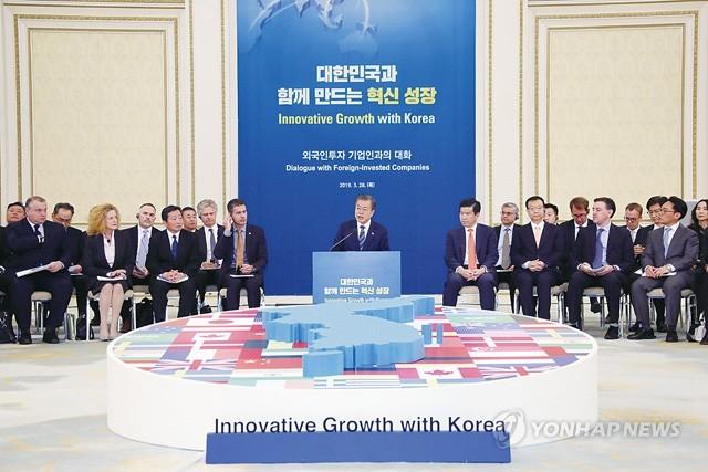 문재인 대통령이 28일 오전 청와대 영빈관에서 취임 후 처음으로 주한 외국 기업 경영자들을 초청해 개최한 간담회에서 인사말을 하고 있다.