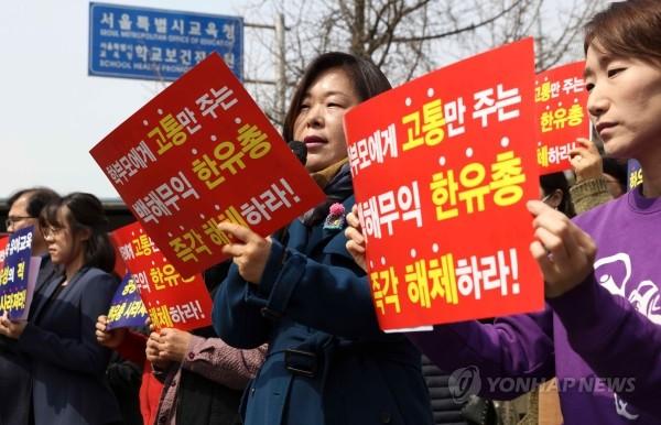 28일 오후 서울시교육청 앞에서 한국유치원총연합회 설립취소 촉구 기자회견이 열리고 있다.